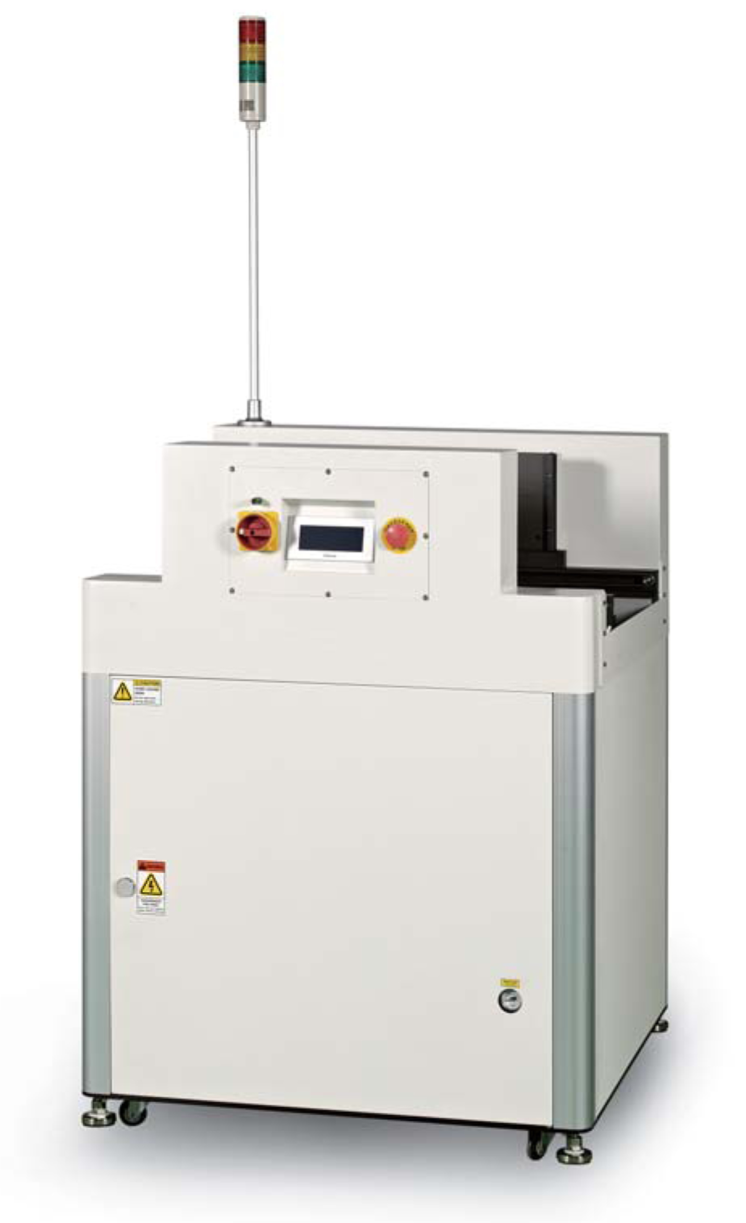 Our MFMH Series of Magazine Sorting Systems have been specifically designed for post AOI sorting of PCBs in a batch process mode. This in-line solution sorts PCBs according to Pass or Fail status. The system passes good PCBs through the magazine and stores suspect PCBs in a magazine. Slot spacing is selectable in 10mm increments. Once the magazine is full, the station alarms, notifying the operator that the magazine needs to be replaced. With the platform lowered, the magazine/platform shuttles forward making magazine removal effortless.