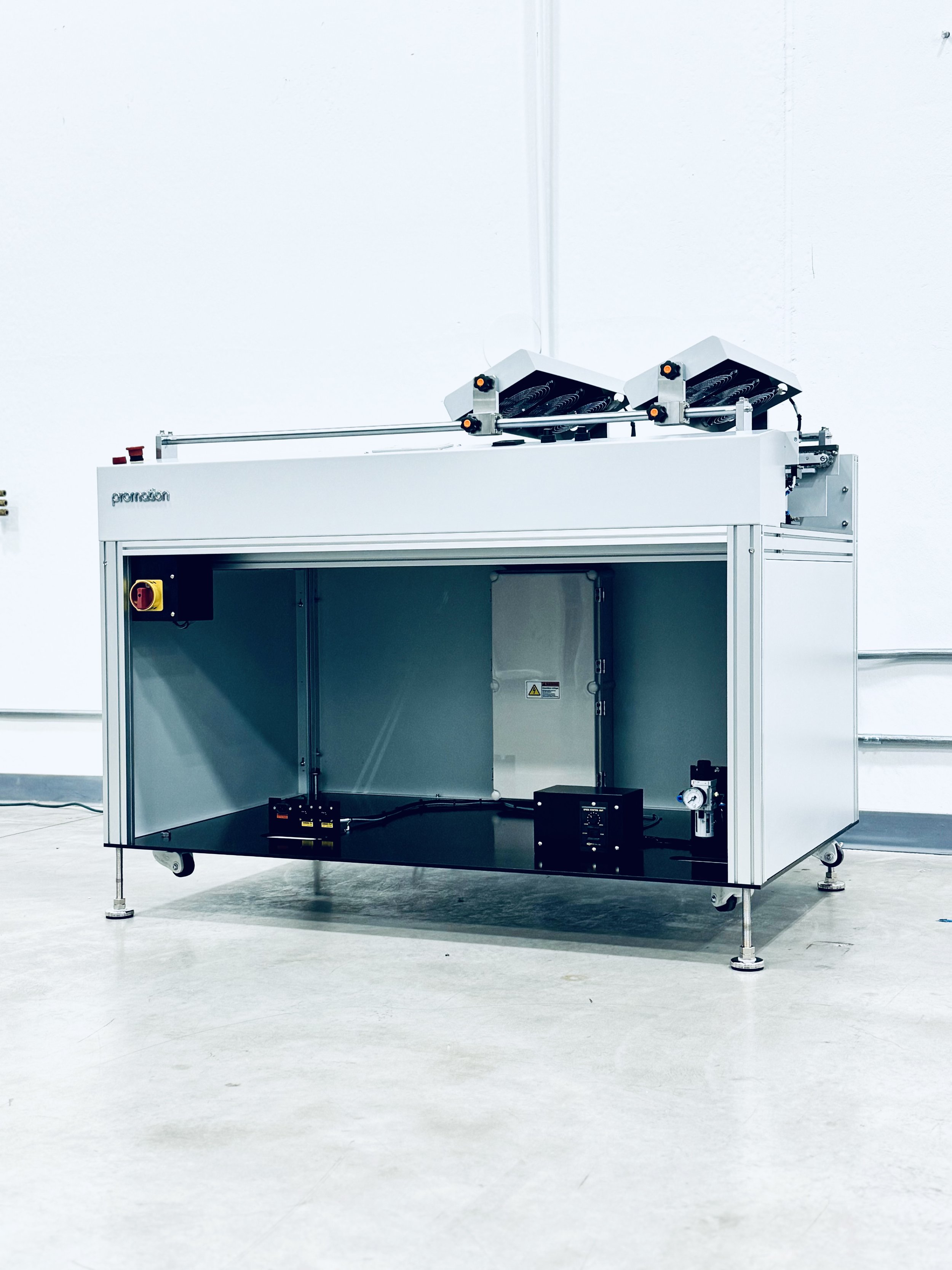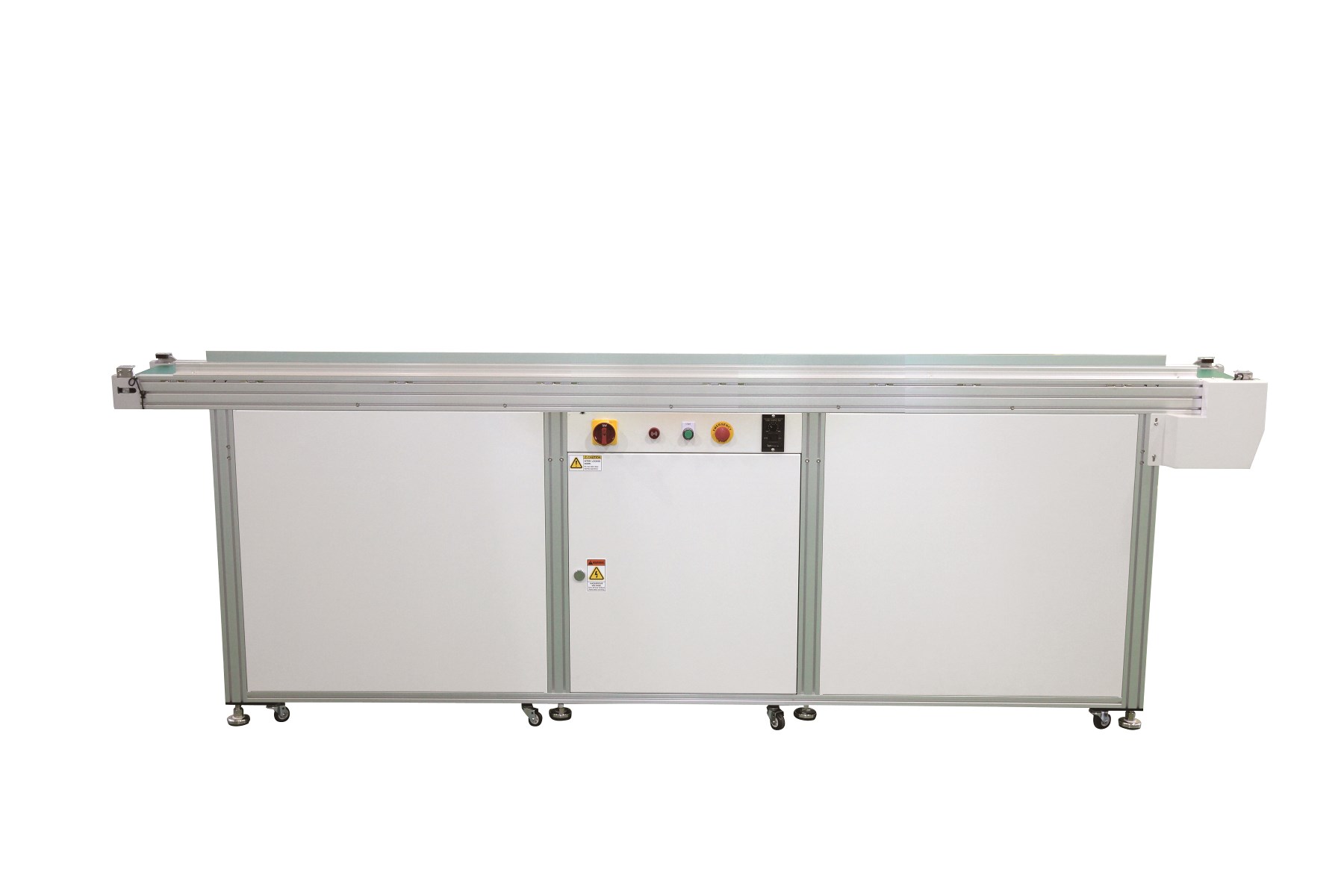 SIGNATURE FEATURES: Programmable Logic Controller. Top cover option with see through window. Single and multi-belt drive configurations available. Bar code reader can be attached (optional). Transport speed (180mm/sec Fixed) Variable speed control (optional) Thermal probe option releases PCB when a certain temperature has been met. Dual E-Stops (Optional)and master On / Off switch. Cooling fan options available. Retractable hand crank for width adjustment. Includes two standard SMEMA cables. Lengths: 500mm up to 3000mm. "Left to Right" process flow – front fixed rail (standard). "Right to Left" process flow – front fixed rail (optional). ESD grounding receptacle (Optional)& audible alarm. Roller wheels allowing for easy movement. Powder coated vanity panels, “PROMATION White" or "Light Gray”. Conforms to SMEMA spec. 1.2 / NFPA 79 Custom systems also available to meet any production need.