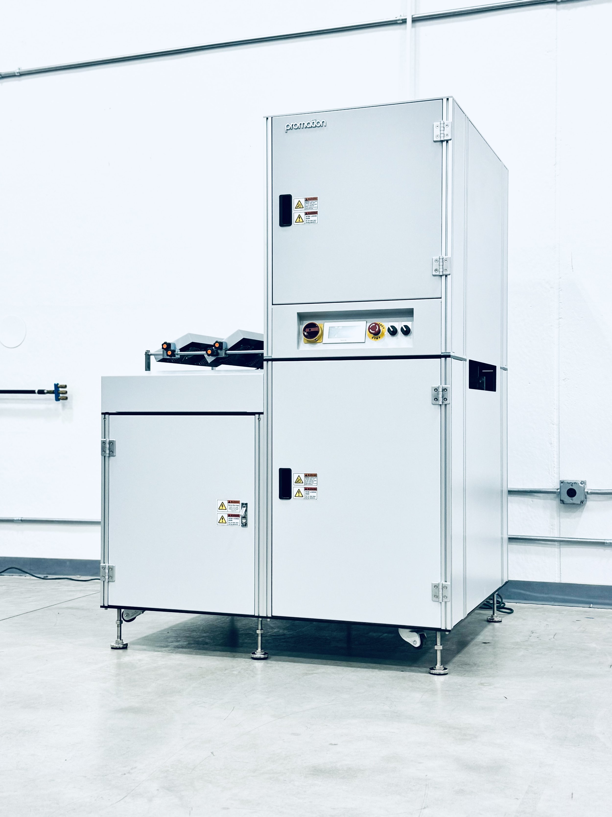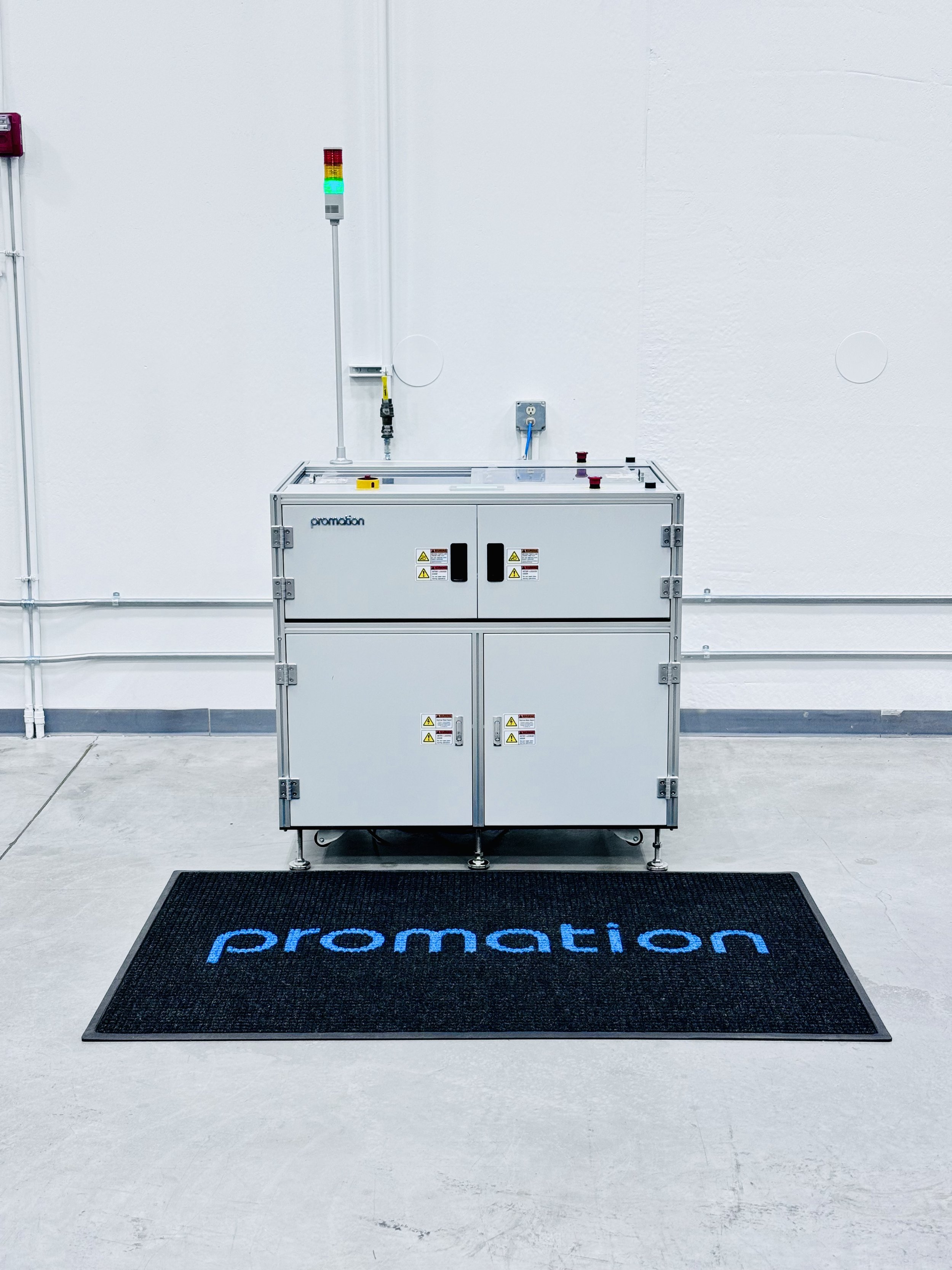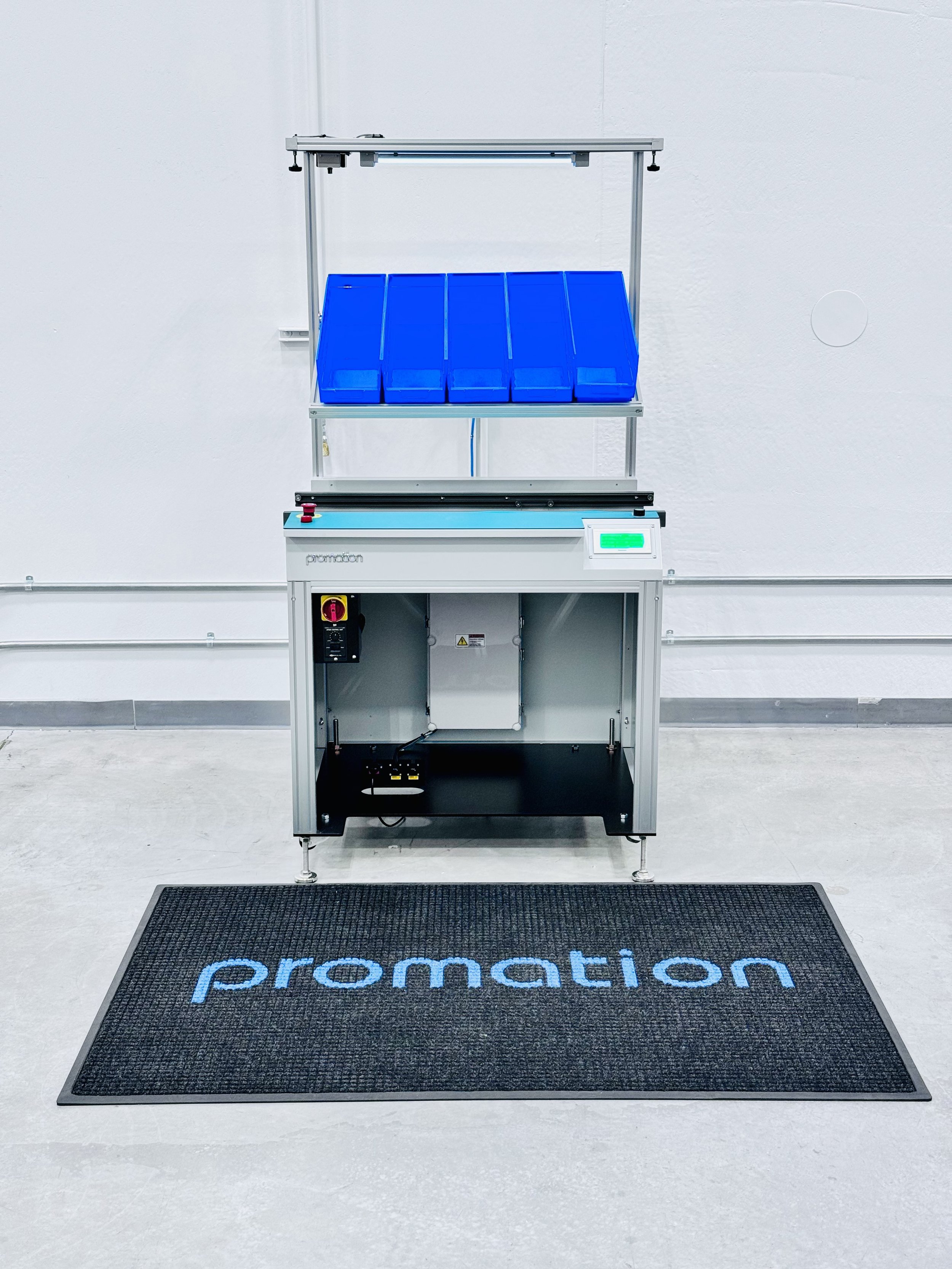SIGNATURE FEATURES: ESD grounding receptacle (Optional)and audible alarm. Roller wheels allowing for easy movement. Powder coated vanity panels, "PROMATION White" or "Light Gray". Conforms to SMEMA spec. 1.2 / NFPA 79 Includes two standard SMEMA cables. Top cover option available. Bar code reader (s) (optional). Full alert and light tower (3 color) (optional) Cooling fan (optional). Programmable Logic Controller. Single drive configuration (multi-stop locations also available). Variable speed control. Dual E-Stops (Optional)and master On / Off switch. Retractable hand crank for width adjustment. Automatic width adjustment (optional). Left to right process flow - front fixed rail (optional). Right to left process flow - front fixed rail (optional). Rear fixed rail options available.