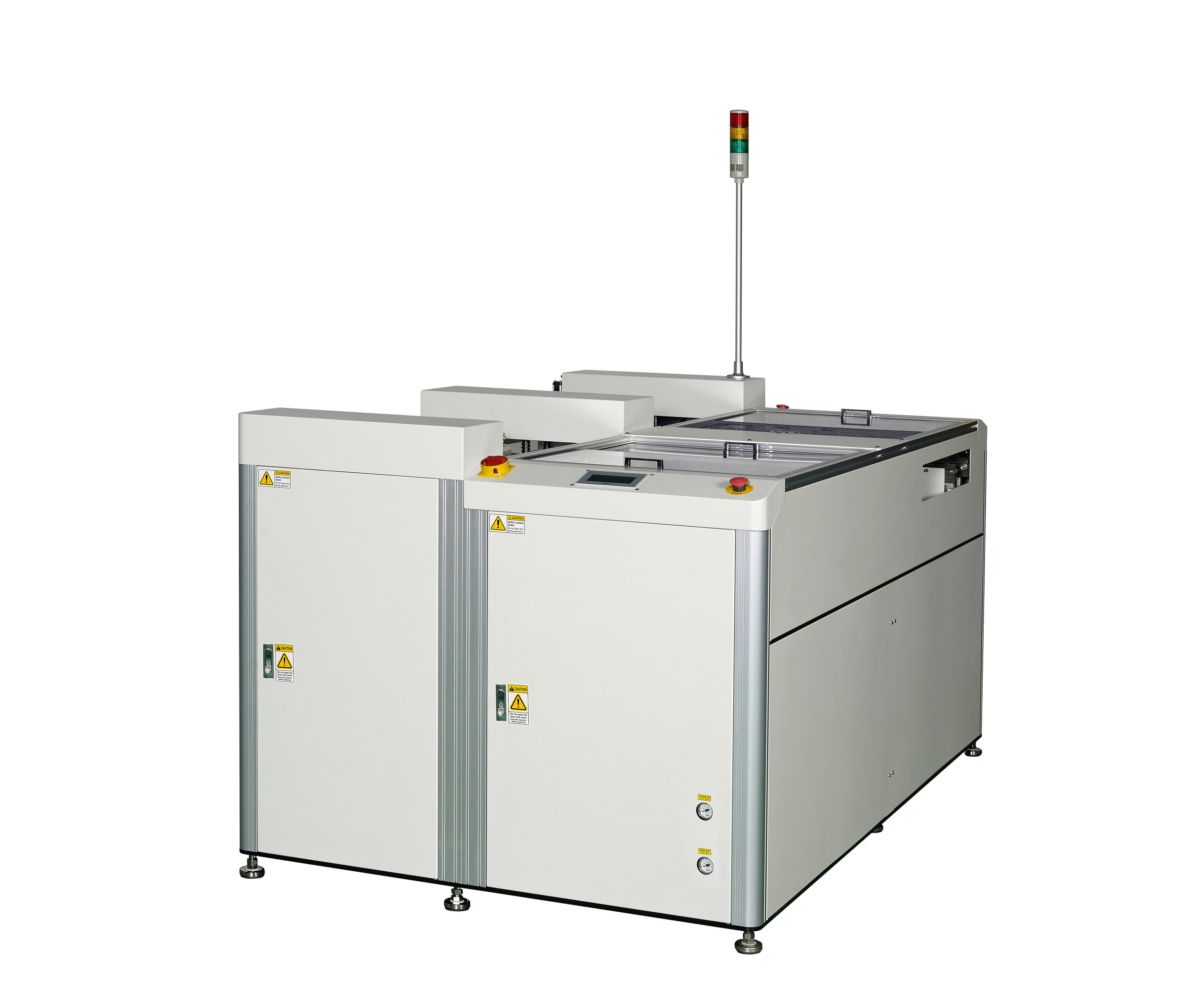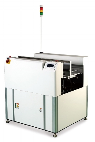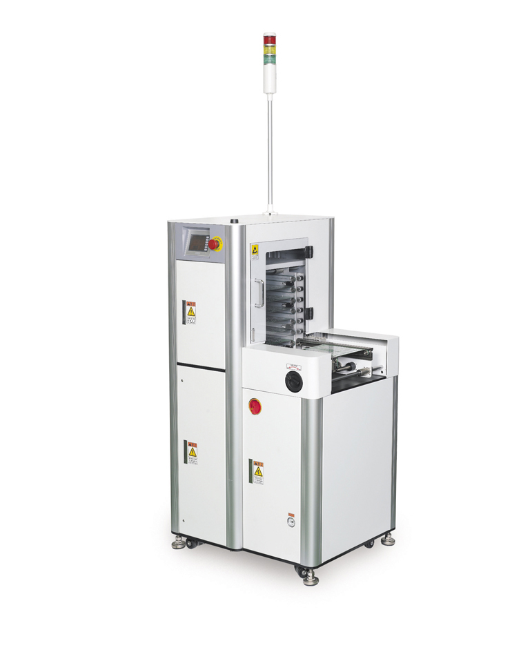 SIGNATURE Features: PLC controlled Touch Panel User Interface Select No of PCBs and Pitch SMEMA 10 ~ 50mm pitch selection Front Loading Solution Automatic Magazine Change-over LED Status Light Tower Safety Covers 50 slot magazines @ 10mm pitch Available options: Electric type pusher Automatic pusher alignment PCB Exit guide (manual or motorized) RS-485 Communication 900mm nominal pass line