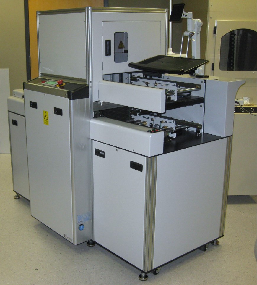 EBL-800 (loader) ebu-800(unloader): Our EBL and EBU systems have been designed to operate in a Class 100K clean rooms and provide reliable handling to either substrates or ceramic type products. The Line Loader handles products from an aluminum carrier (Auer/ Precision / Others) than transfers the product to the next station. The Line Unloader is designed to accept product (from the line) and return the product to the carrier for safe storage. Optional carrier orientation validation and bar code readers are available.