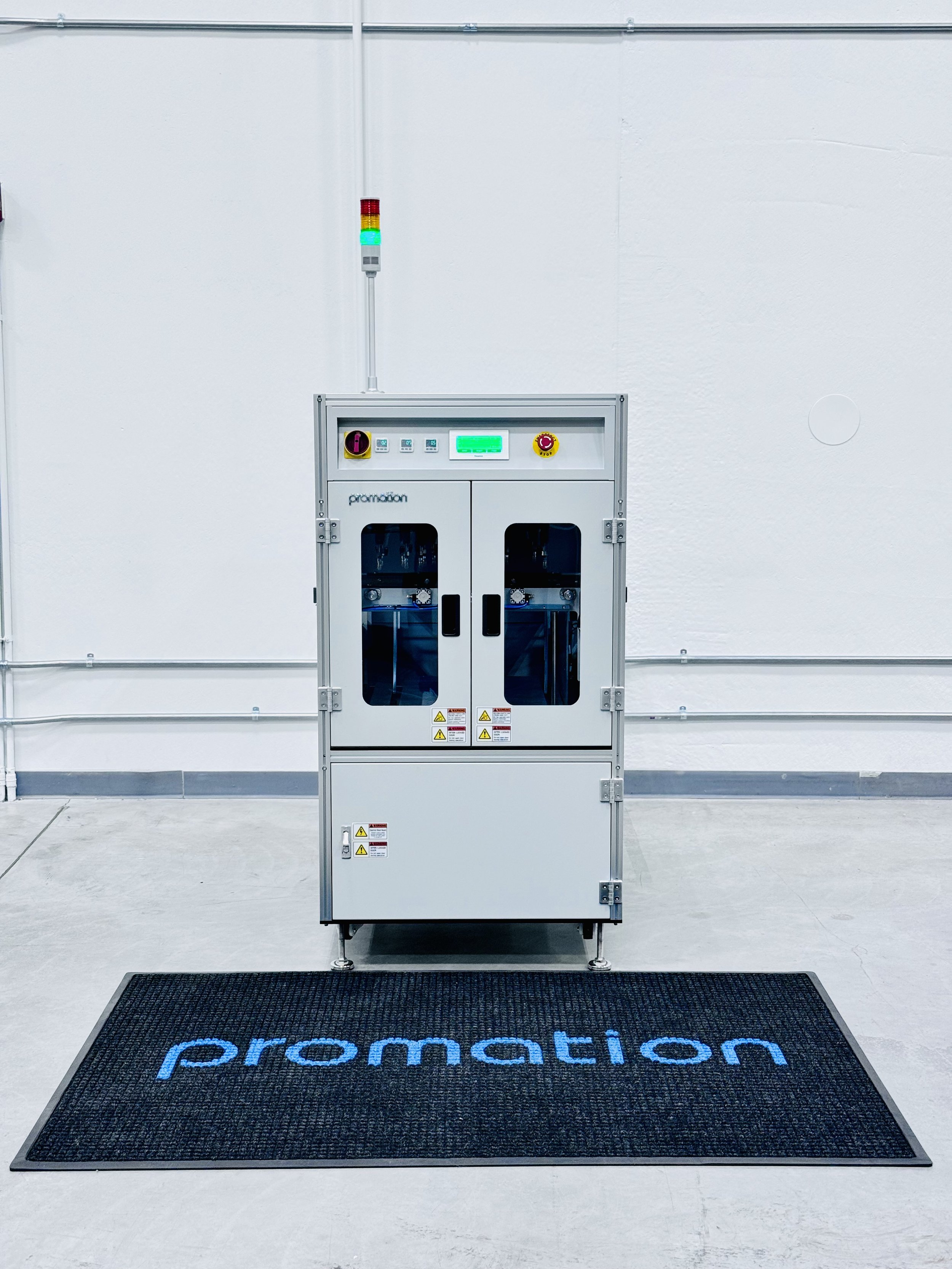 SIGNATURE FEATURES: Programmable Logic Controller. Single drive configuration (with rail separation). Transport speed (180mm/sec Fixed) – Variable speed optional. Dual E-Stops and master On / Off switch (Optional). Hand crank for width adjust. Automatic width adjustment (optional). Full safety cover enclosure with ESD safe windows. Roller wheels allowing for easy movement. "Left to Right" process flow, front fixed rail (standard). Right to left process flow – front fixed rail (optional). ESD grounding receptacle (Optional) & audible alarm. Powder coated vanity panels, “PROMATION White" or "Light Gray”. Conforms to SMEMA spec. 1.2 / NFPA 79 Includes two standard SMEMA cables. Independent vacuum cup control* (On~Off) PCB counter.