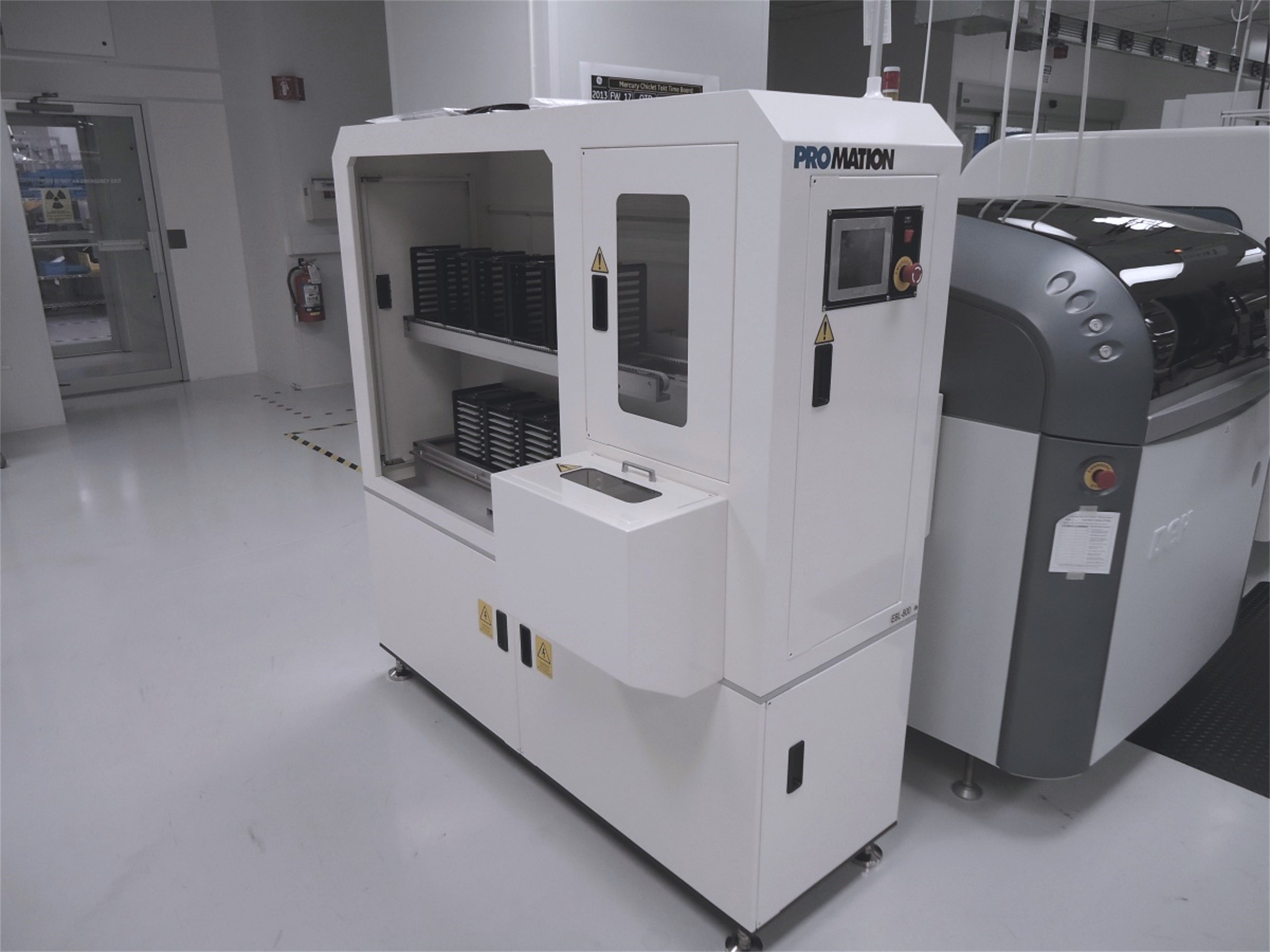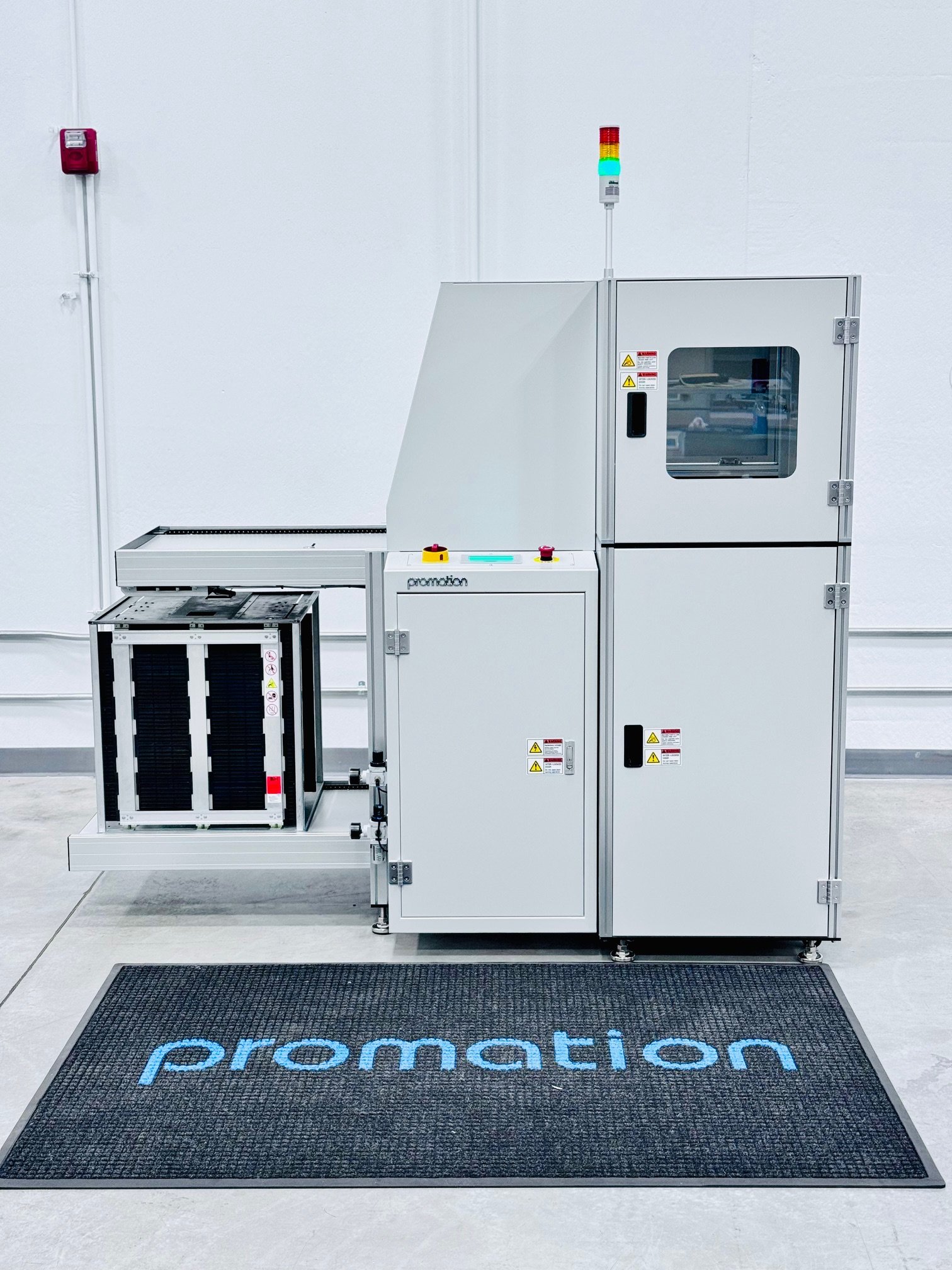SIGNATURE FEATURES: Programmable Logic Controller. High capacity carrier rack. LCD touch panel interface. Capable of handling up to 5 aluminum magazines top / bottom. Operator controls: E-Stop, Reset, Touch Panel. Left to right process flow. Front fixed rail. Audible alarm and 3 color light tower. Angled buffer section minimizes floor space requirements. Automatic magazine change over. Optional bar code readers. Optional carrier orientation verification. Includes standard 14-pin communication cable (4 pin configuration). Powder coated vanity panels, "PROMATION White" or "Light Gray". Conforms to SMEMA Spec. 1.2 / NFPA 79 Automatic