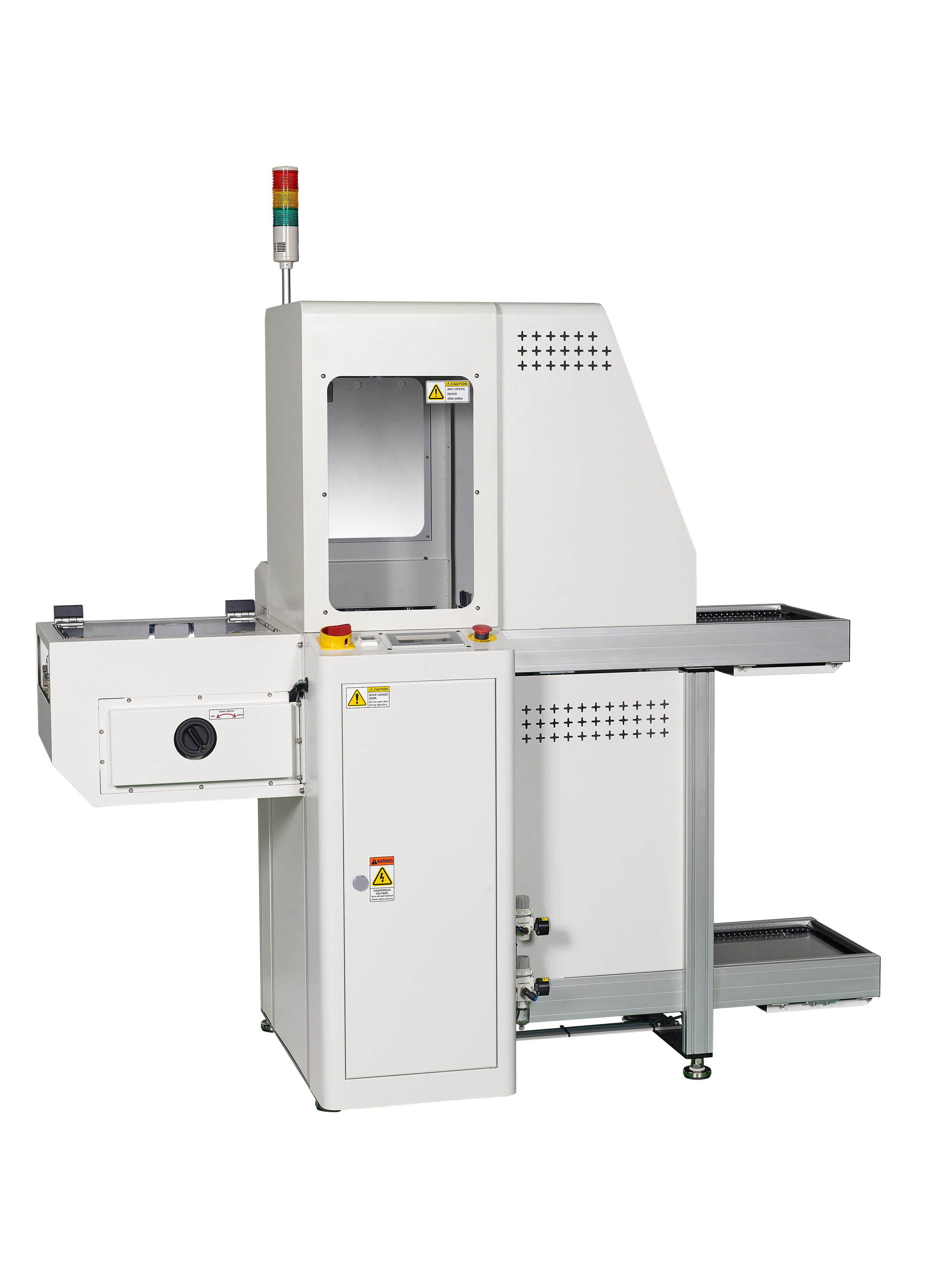 SIGNATURE FEATURES: PLC Controlled Touch Panel User Interface Automatic Width Adjustment Sorting SMEMA Safety Curtain Sort and Pass mode selection AVAILABLE OPTIONS: Conveyor speed control Monitor / Keyboard mount Front work surface RS-485 Communication 900mm nominal pass line LED Status Light Tower